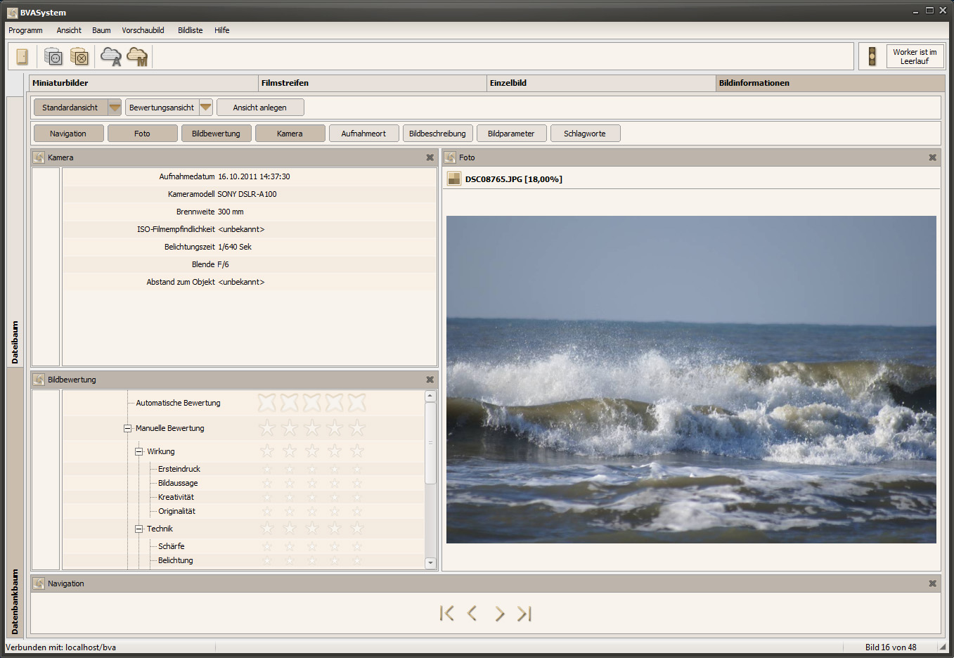Die Bildinformationsansicht ist die flexibelste Ansicht, die das BVASystem zu bieten hat. Hier können alle Informationen, die mit einem Foto verknüpft sind angesehen bzw. editiert werden. Im Gegensatz zu den anderen 3 Ansichten ist der Aufbau der Bildinformationsansicht nicht fest vorgegeben. Hier kann die Positionierung der einzelnen Bereiche selbst bestimmt werden. Es ist sogar möglich, sich mehrere Positionierungen zu bestimmen, damit man für jeden Anwendungsfall die optimale Ansicht zur Verfügung hat.